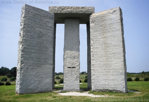 Скрижали Джорджии (Georgia Guidestones) давно стали одной из самых известных достопримечательностей США и часто именуются в популярной культуре не иначе, как «Американский Стоунхендж». Высота монумента, состоящего из шести гранитных плит общим весом более ста тонн, превышает шесть метров. Одна плита находится в окружении четырех других, а последняя установлена на них сверху. Все они выровнены согласно астрономическим событиям. Немного западнее памятника на земле находится табличка из камня, надпись на которой рассказывает о назначении и возникновении Скрижалей. Состоит эта надпись из десяти заповедей (принципов) и выгравирована на восьми современных языках.