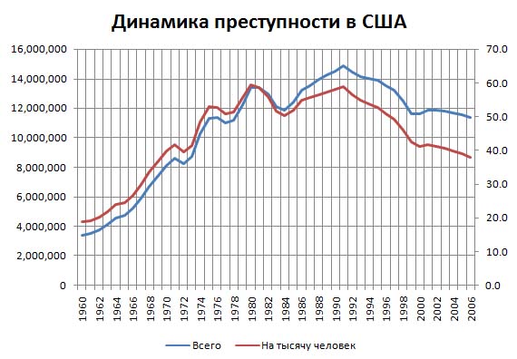 В 2008 году в США было совершено 11 миллионов 150 тысяч преступлений, в том числе 16 тысяч убийств (5,2 убийства на 100 тысяч жителей). Преступность в США ежегодно снижается с 1991 года, когда было совершено около 15 миллионов преступлений.